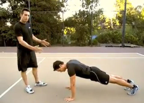 In the down position, the body is a straight line, the arms are flexed to a 90 degree angle, and the head and shoulders are in front of the hands. See video demonstration for full tutorial. Rather than going straight down, the demonstrator's body effectively rotates around the toes, which are a kind of pivot point.