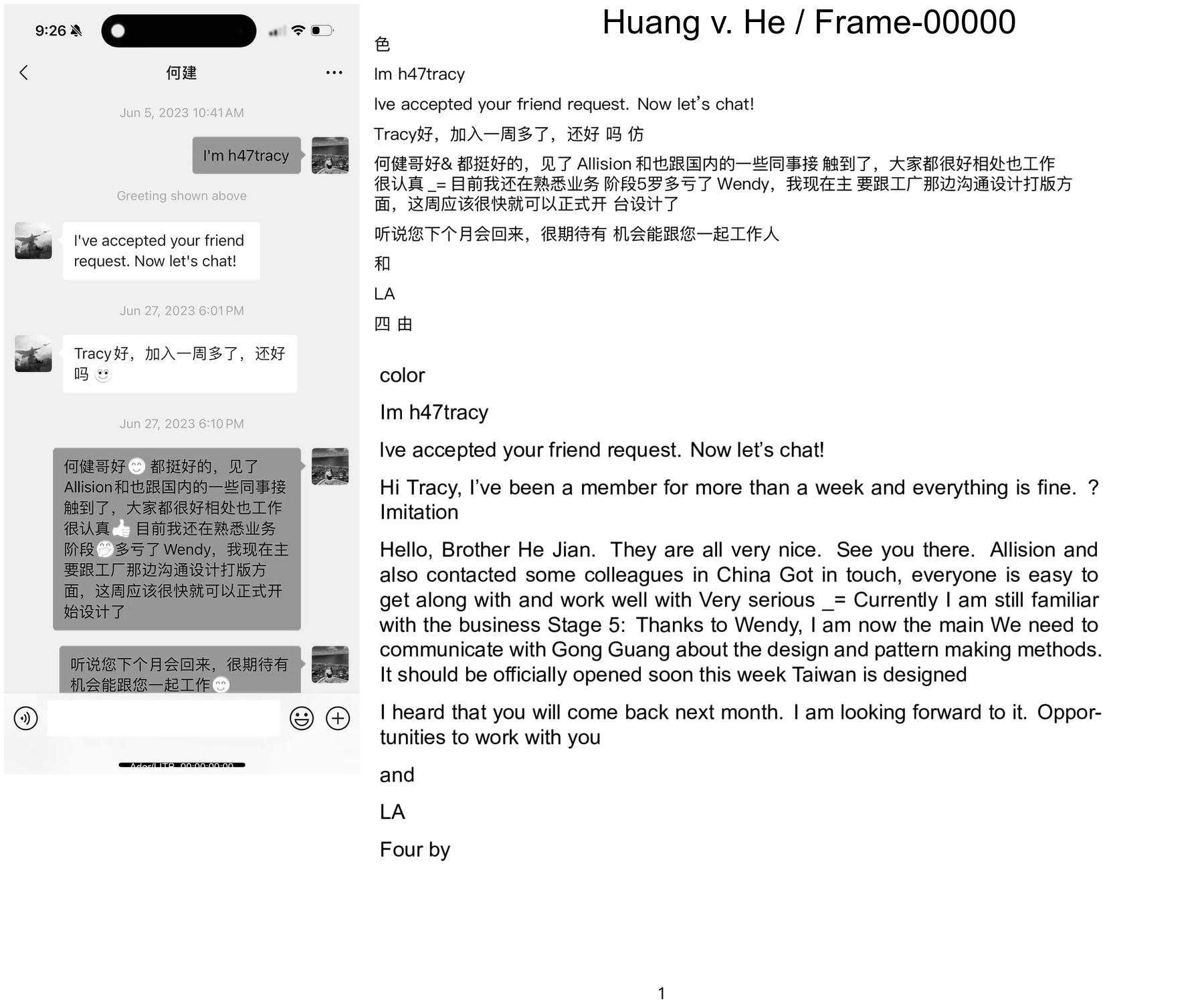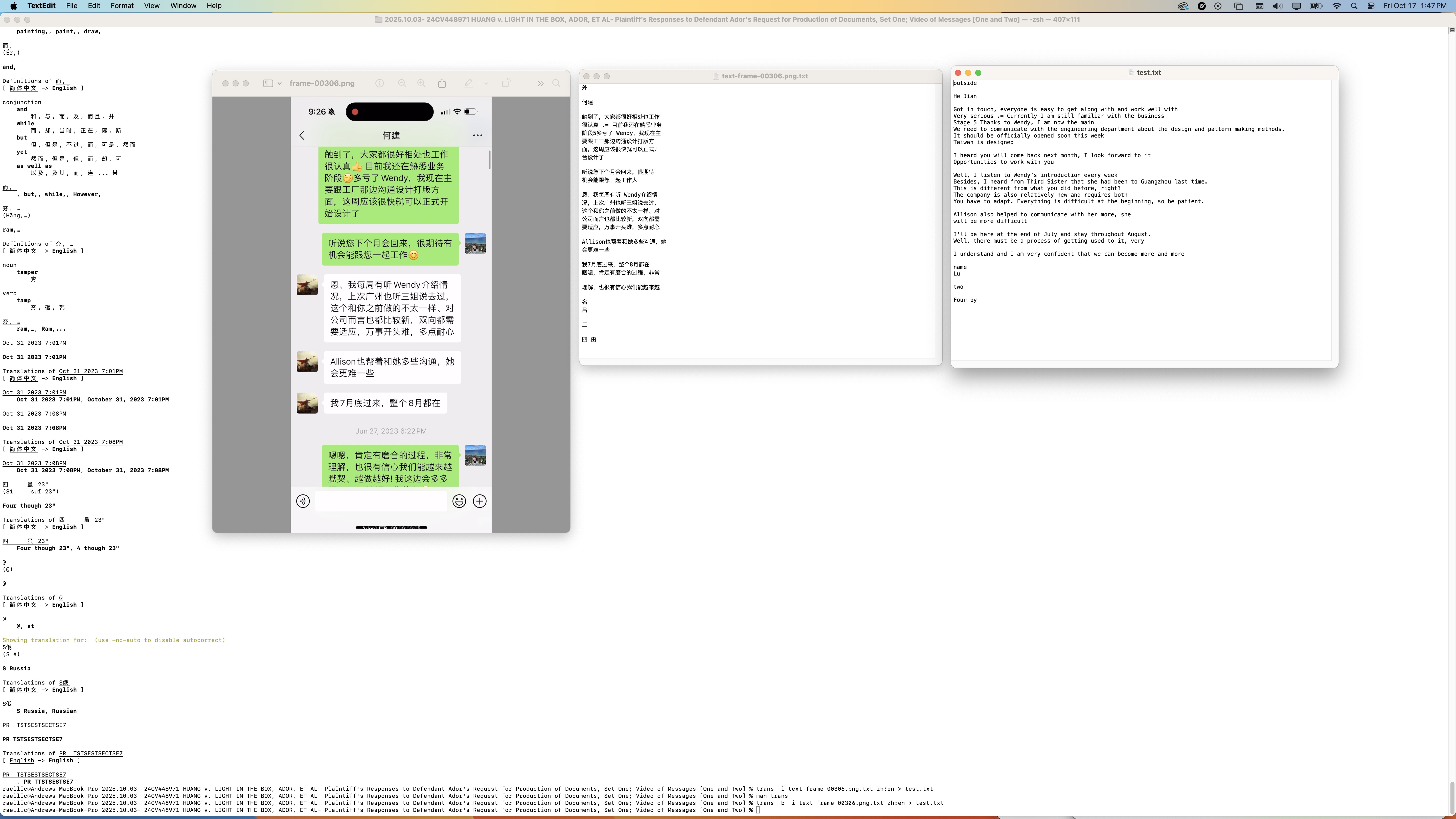 The plaintiff produced a 23-minute screen recording of herself scrolling through WeChat chat histories and probably 1,000 messages. Rather than spend thousands of dollars having a professional translator tediously go through the video, I extracted still frames once per second using ffmpeg, recognized Chinese text with the free tool tesseract, and translated the text with the translate-shell command line tool. Success! I could make a business out of doing this.
