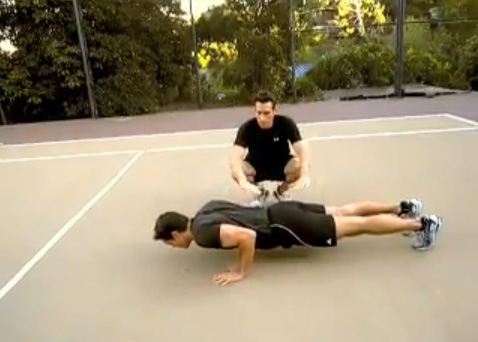 In the down position, the body is a straight line, the arms are flexed to a 90 degree angle, and the head and shoulders are in front of the hands. See video demonstration for full tutorial. Rather than going straight down, the demonstrator's body effectively rotates around the toes, which are a kind of pivot point.